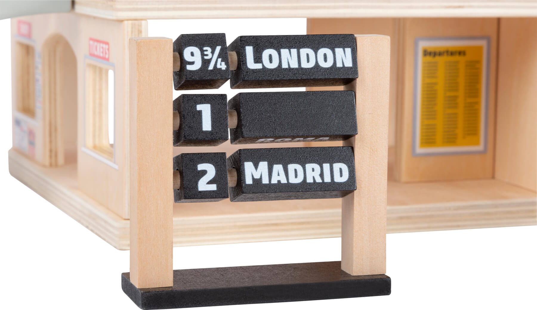Alle Mann einsteigen – die Türen schließen! Mit dem Bahnhof mit Zubehör aus FSC® 100%-zertifiziertem Holz wird jedes Kinderzimmer im Handumdrehen zum Großstadtbahnhof. Der zweistöckige Aufbau, zahlreiche Schienenelemente und liebevolles Zubehör wie Ticketautomat, Anzeigetafel und Schnellzug sorgen für ein besonders realistisches Spielerlebnis.