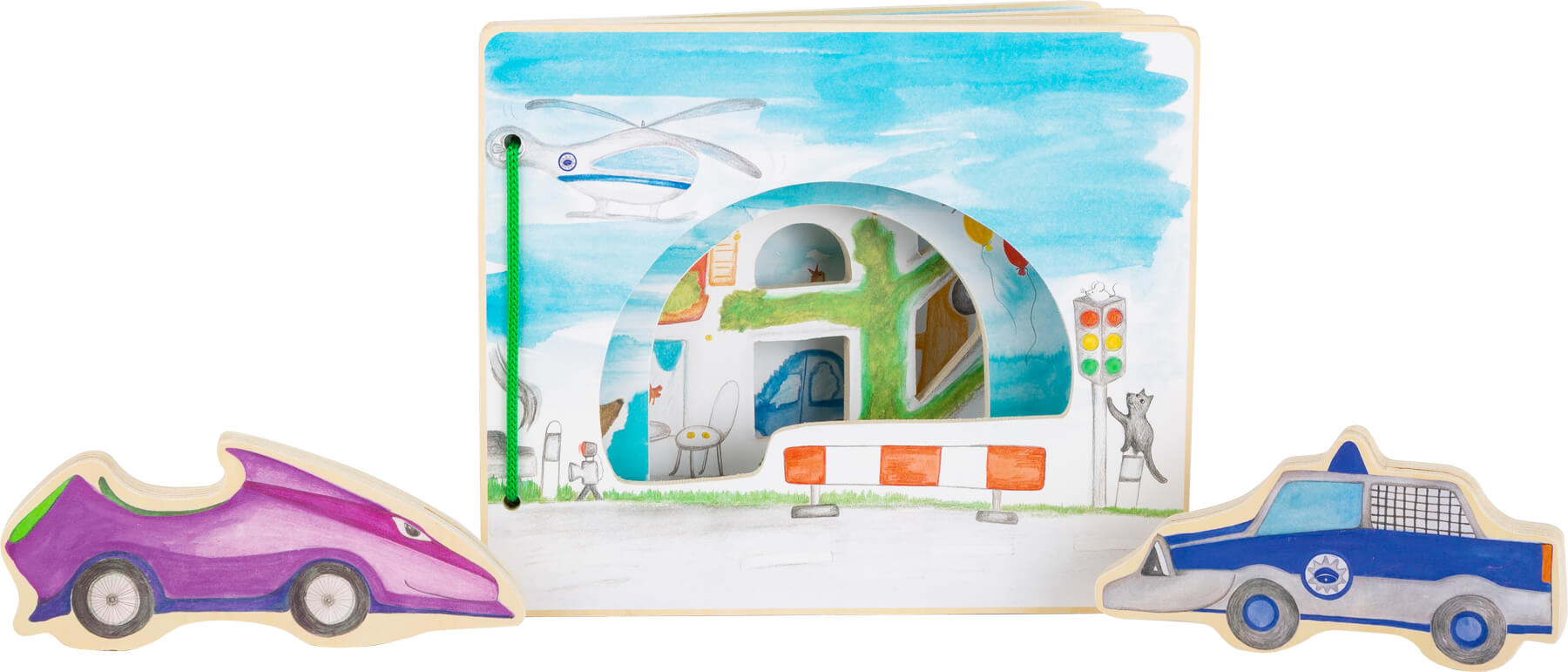 Hier ist Action garantiert! Mit diesem liebevoll gestalteten interaktiven **Bilderbuch Polizei** aus FSC® 100%-zertifiziertem Holz lernen Kinder spielerisch die Polizei und ihre wichtige Funktion kennen. Das Besondere: Die Holzfiguren – ein Polizeiauto und ein Verbrecher-Auto – können abgenommen werden, um die Geschichte nachzuspielen oder sich eine eigene auszudenken. Nach der actiongeladenen Jagd werden die Autos einfach per Klettverschluss auf der Rückseite des Buches befestigt. Ein lehrreiches Buch, das Fantasie und Geschichtenerzählen fördert!