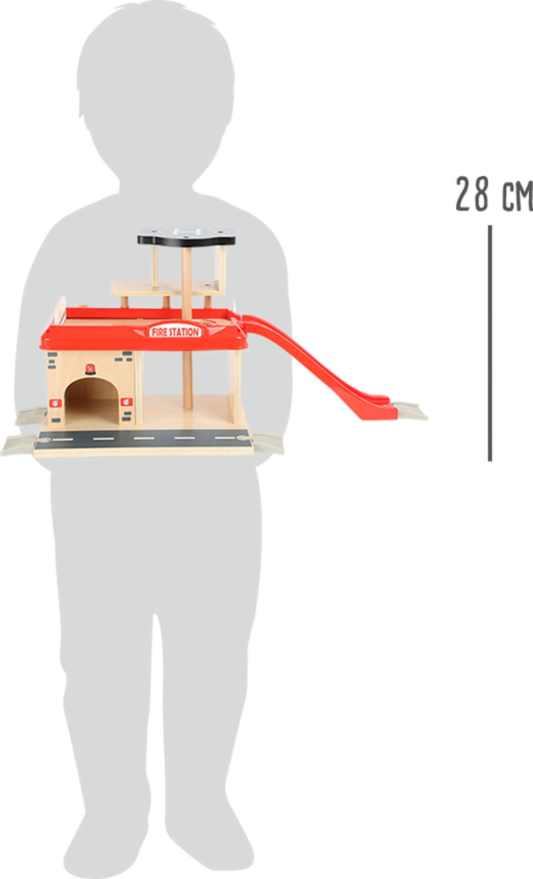 Alarm! Einsatz! Die Feuerwache aus der small foot world-Spielwelt verspricht abwechslungsreichen Spielspaß. Das Set aus FSC® 100%-zertifiziertem Holz und stabilem Kunststoff mit viel Zubehör wie Rutsche, Helikopter, Feuerwehrmann, Feuerlöscher und Einsatzwagen lässt action-begeisterte Kids viele spannende Abenteuer erleben. Plötzlich geht ein Notruf ein: Rutsche die Feuerwehrstange oder die Rutsche herunter, öffne die Garage und fahre mit dem Feuerwehrauto so schnell wie möglich zum Einsatzort! Der Hubschrauber unterstützt aus der Luft. Lösche das Feuer mit dem Feuerlöscher und alles wird gut! Die Feuerwehrstation ist ein tolles Spielzeug für feuerwehrbegeisterte Jungen und Mädchen und macht garantiert lange Freude im Kinderzimmer — auch in Verbindung mit den vielen anderen small foot world-Produkten.