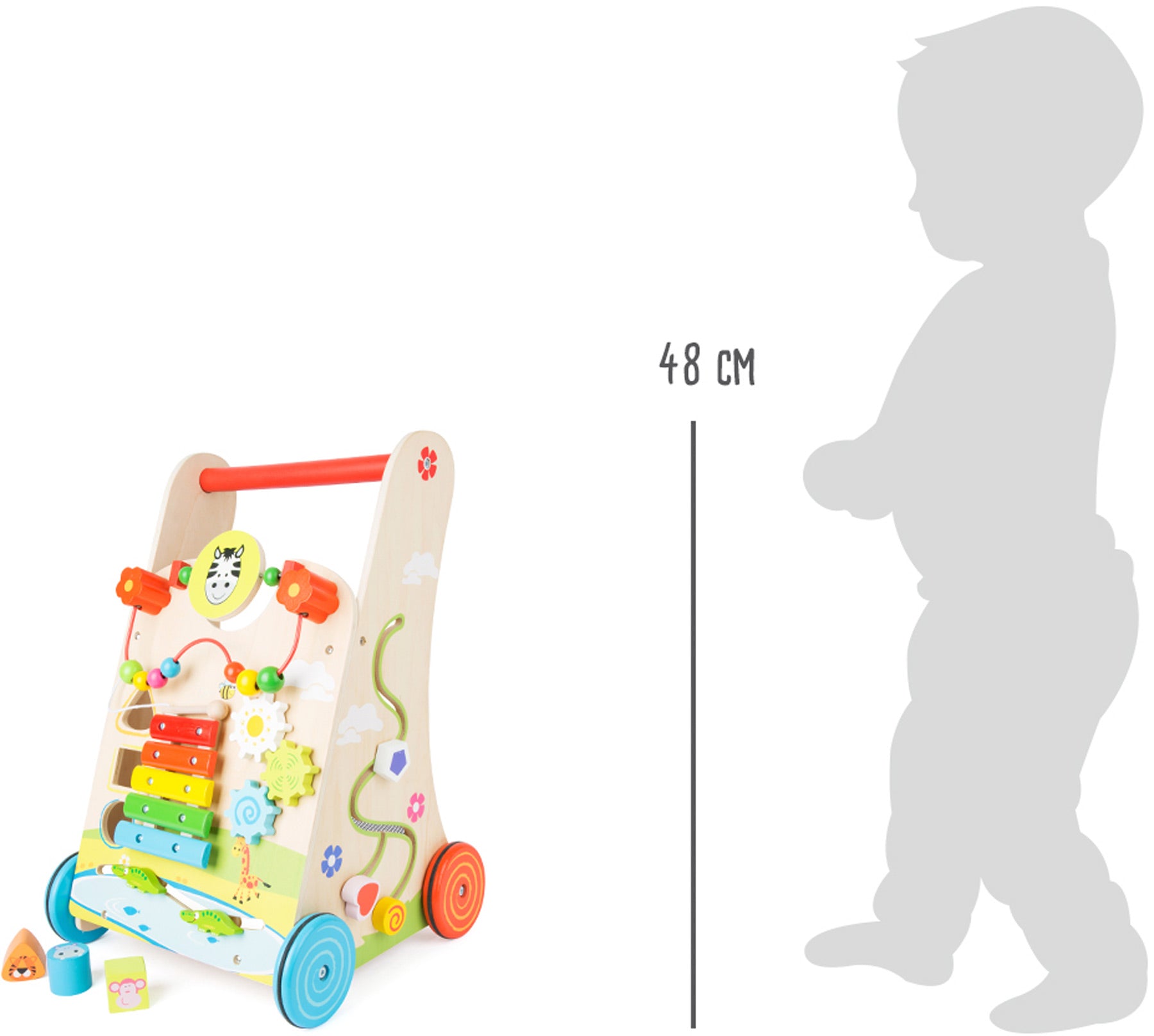 Aktiv auf allen Ebenen! Der stabile Lauflernwagen stellt mit vielfältigen Spielmöglichkeiten für alle Sinne bereit, was kleinen Entdeckern die Erkundung ihrer Welt ermöglicht. Ein Xylophon mit 5 Klangstäben, mehrere Schiebespiele und eine Motorikschleife mit bunten Perlen, Zahnräder und ein Steckspiel samt Auffangnetz (das auch als Reiseunterkunft für den Lieblingsteddy geeignet ist). Die Räder sind mit ihrer rutschhemmenden und geräuschdämmenden Gummiringbereifung das Tüpfelchen auf dem i. Der Lauftrainer ist eine immer wieder neu zu entdeckende Spiel- und Lernwelt für alle Sinne!