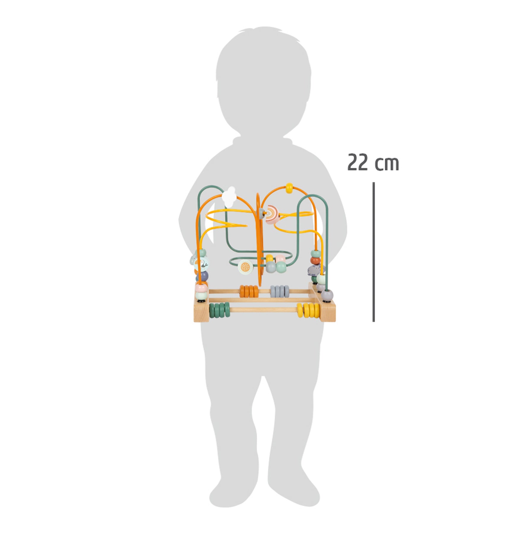 - Zusätzlicher Lerneffekt: Zwei Holzstangen mit Ringen zum Schieben und ersten Zählen
