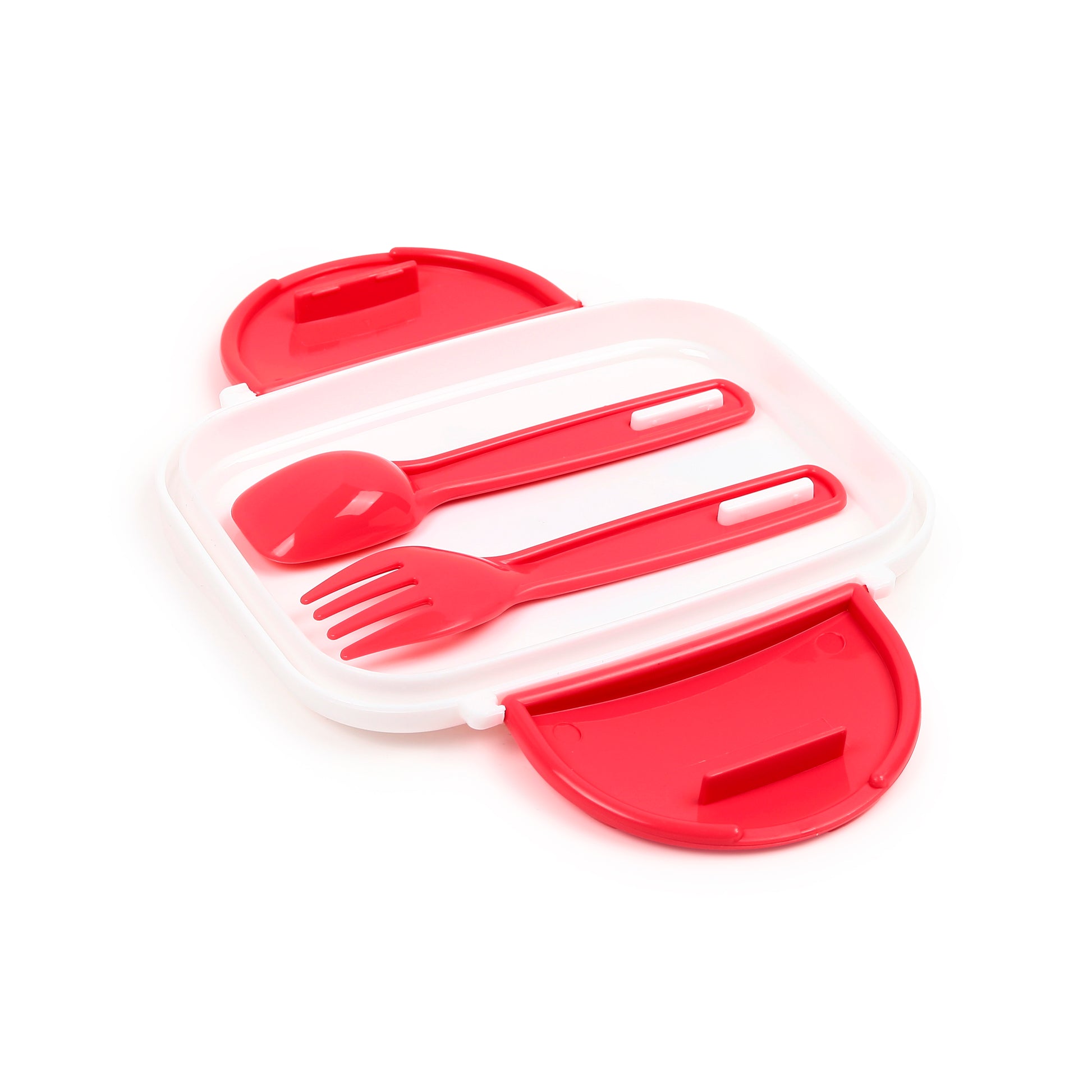 Dank der zwei stapelbaren Etagen kannst du Hauptspeisen und Snacks sauber voneinander trennen. Die Box wird durch zwei seitliche Clipverschlüsse sicher zusammengehalten. Das mitgelieferte Besteck (Gabel und Löffel) findet bequem Platz in der Box, sodass du für jede Mahlzeit gewappnet bist.