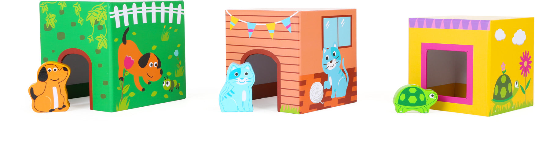 Stapelwürfel-Set aus stabilem Karton mit sechs passenden Tierfiguren aus Holz. Die Würfel können in der richtigen Reihenfolge gestapelt werden und ergeben auf der Seitenfläche ein Motiv. Jeder Würfel verfügt über Öffnungen zum Einsetzen der Tierfiguren.